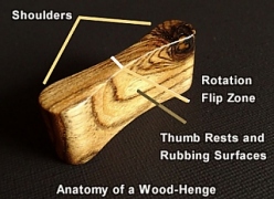 The same as the Wood-Henge classic with two curved sides except I have added another surface on the side to rub or fidget with. Three working sides in total. Also, the size is a little thicker which allows for enough room to have another surface to rub and fidget with. This Wood-Henge is about 150% thicker than "the Classic" model. The length is about the same as the Wood-Henge Classic however, all are slightly on the wider side - about 7/8 to 1 inch wide. This gives more stability when rubbing the one side of the Wood-Henge curve. The Curve still flips nicely through your fingers. |